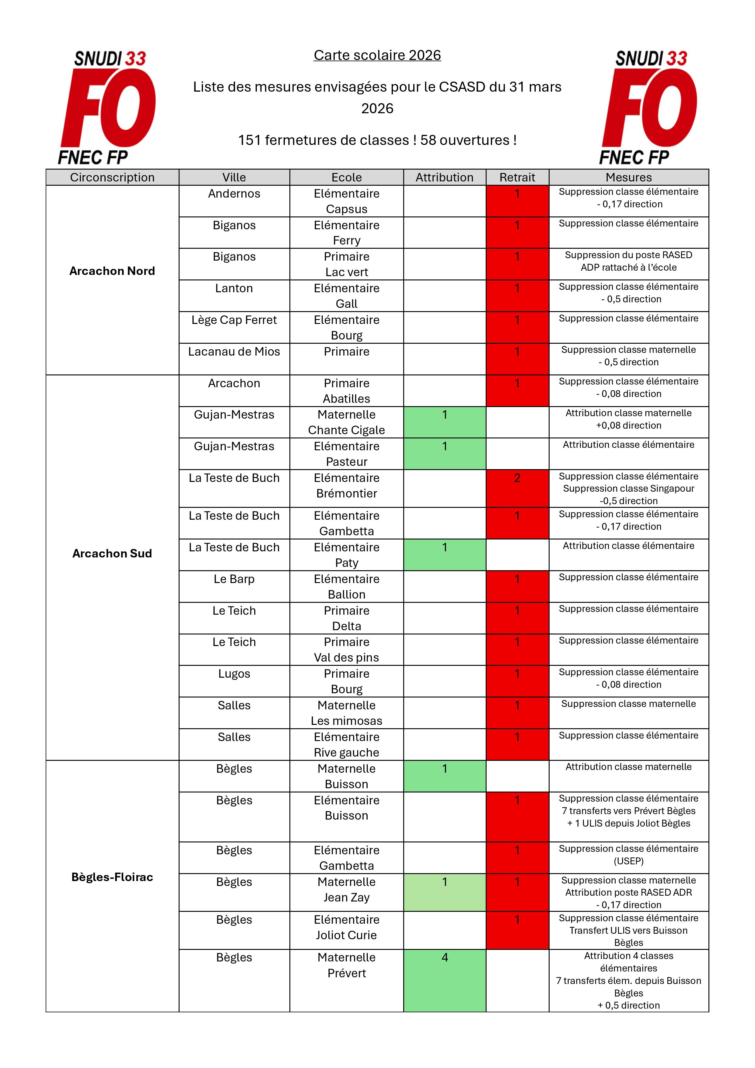 Carte scolaire 2026 : 151 fermetures de classes ! Une saignée !