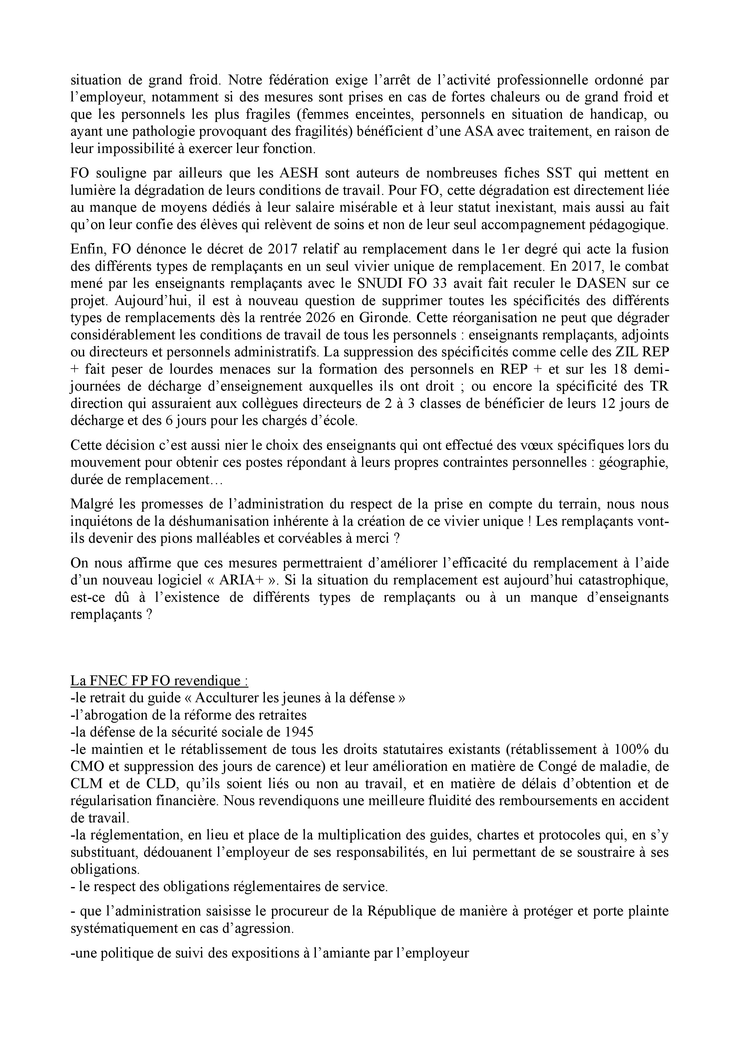 La première instance de l'année 2026 de la FSCT départementale, sur les conditions de santé et sécurité au travail s'est tenue le 6 janvier. L'occasion pour FO de rappeler dans sa déclaration préalable son attachement indéfectible à la défense des droits des personnels : « Une nouvelle année commence avec, nous l’espérons, de bonnes résolutions de notre Ministère et de notre gouvernement… A défaut d’avoir obtenu la satisfaction de nos revendications en 2025, nous allons les réitérer en 2026 ! Le congrès de notre fédération, qui vient d’avoir lieu, affirmait ceci : « Non à l’économie de guerre ! » En effet, les attaques contre les droits sociaux et le Statut se poursuivent, au nom d’économies forcées au bénéfice de la marche à la guerre, avec toutes les conséquences qui en découlent en terme de droits des personnels et de conditions de travail. ». Vous retrouverez la totalité de la déclaration ici.