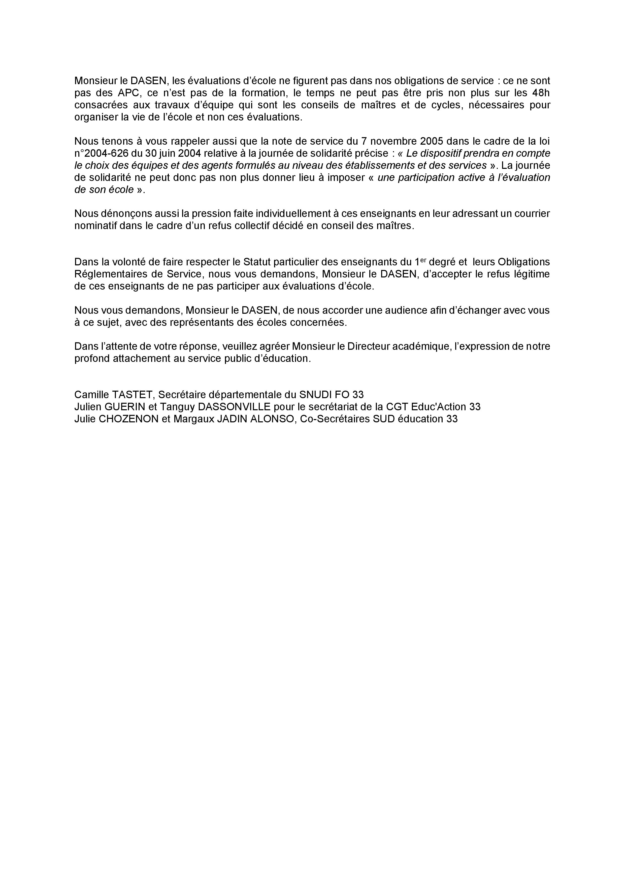 Evaluations d'écoles : courrier au DASEN
