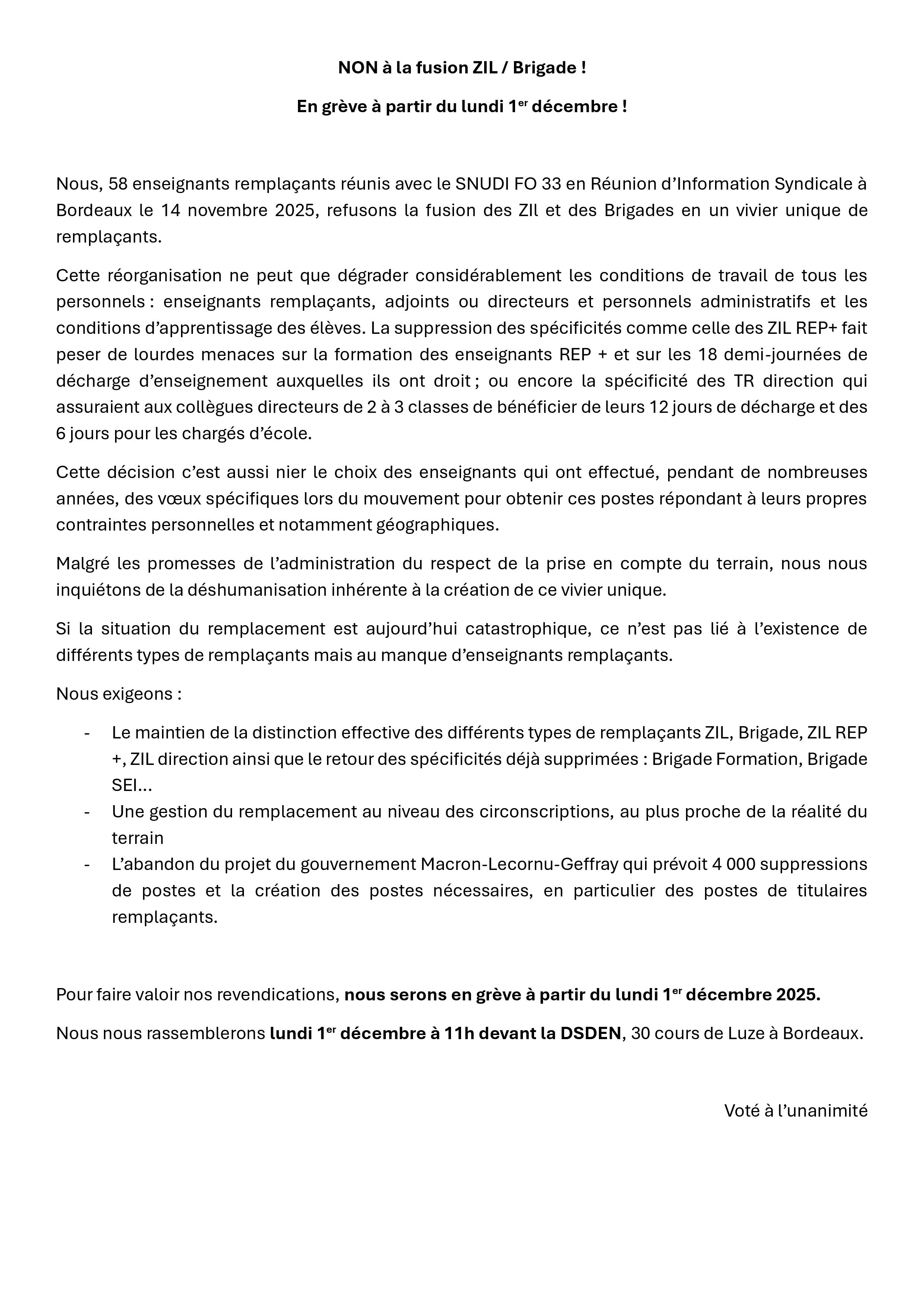 NON à la fusion des ZIL et de Brigades ! En grève à partir du 1er décembre !