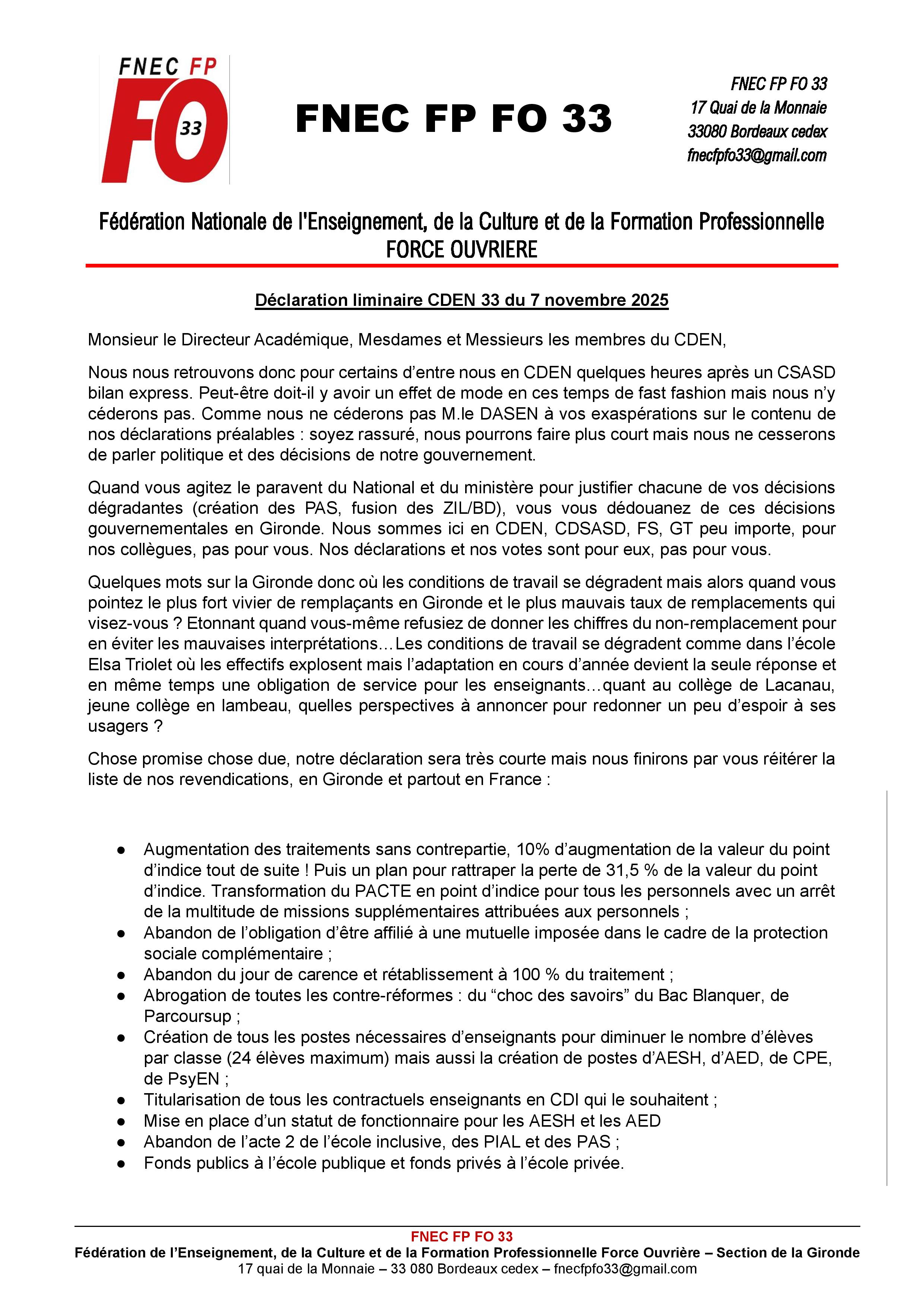 - Ecole primaire Edouard Herriot de Pessac (transfert de la fermeture de Briand vers Herriot innacceptable pour la FNEC FP FO, les 2 écoles ayant droit à une ouverture !)