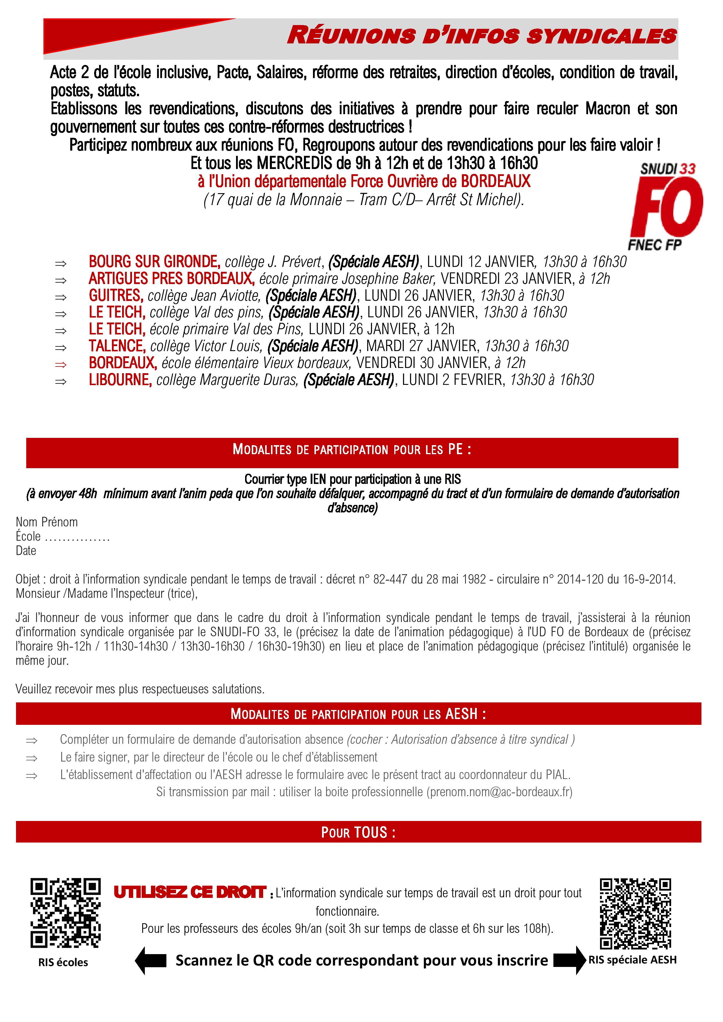 Chaque enseignant a droit à 3h de RIS sur temps de classe. Le SNUDI FO 33 vous encourage à vous inscrire pour la défense de vos droits !