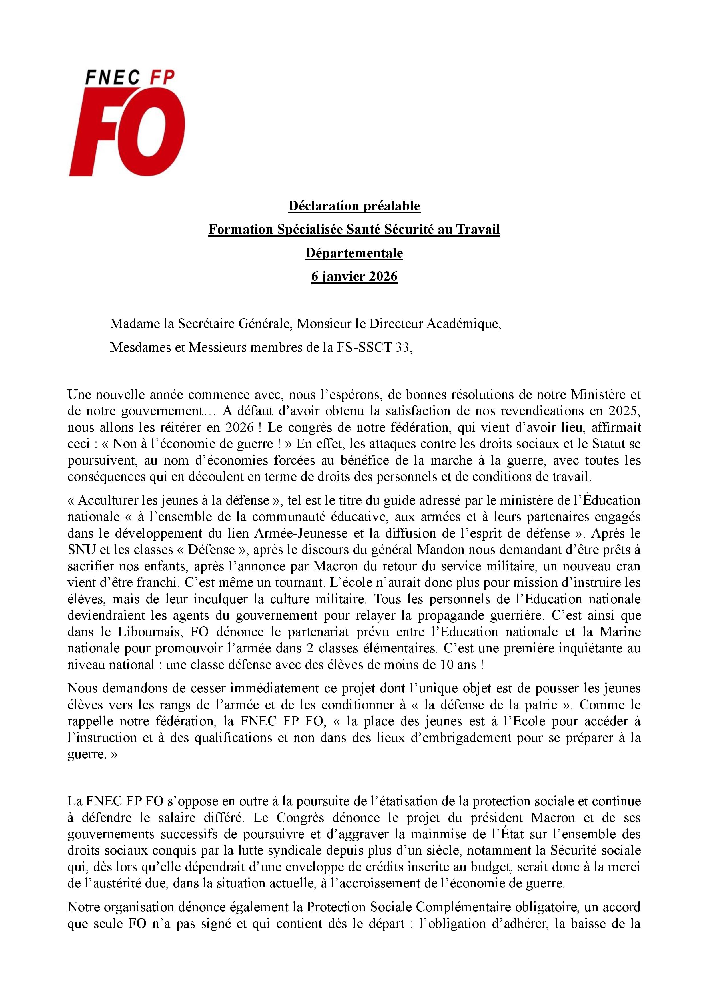 La première instance de l'année 2026 de la FSCT départementale, sur les conditions de santé et sécurité au travail s'est tenue le 6 janvier. L'occasion pour FO de rappeler dans sa déclaration préalable son attachement indéfectible à la défense des droits des personnels : « Une nouvelle année commence avec, nous l’espérons, de bonnes résolutions de notre Ministère et de notre gouvernement… A défaut d’avoir obtenu la satisfaction de nos revendications en 2025, nous allons les réitérer en 2026 ! Le congrès de notre fédération, qui vient d’avoir lieu, affirmait ceci : « Non à l’économie de guerre ! » En effet, les attaques contre les droits sociaux et le Statut se poursuivent, au nom d’économies forcées au bénéfice de la marche à la guerre, avec toutes les conséquences qui en découlent en terme de droits des personnels et de conditions de travail. ». Vous retrouverez la totalité de la déclaration ici.