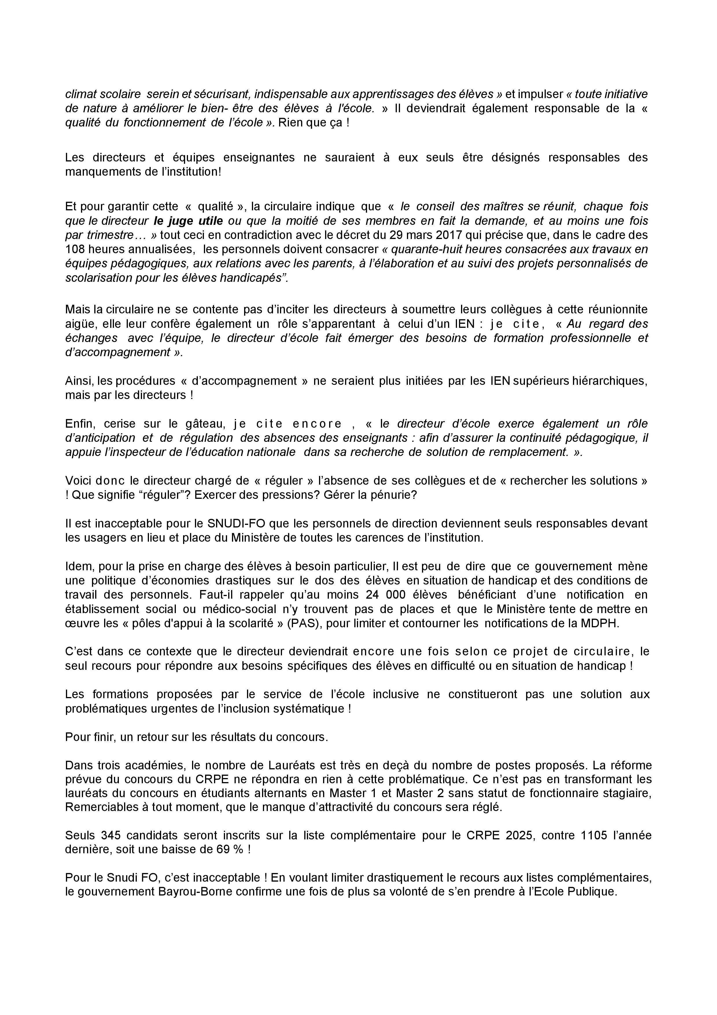 Il est inacceptable pour le SNUDI-FO que les personnels de direction deviennent seuls responsables devant les usagers en lieu et place du Ministère, de toutes les carences de l’Institution.